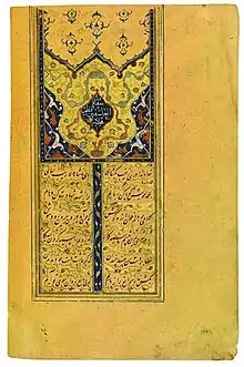 ![]() Persian manuscript of Badr al-Din Hilali's poem Sifat al-'Ashiqin ("Qualities of lovers"). Copied by Shah Muhammad, Safavid Iran, dated early 16th century | |