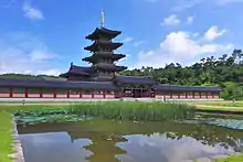 The Jeongnimsa Temple Site layout is a popular architectural layout throughout Korea and has a "pagoda–prayer hall–lecture hall layout".[2]: 12–13 It is located on a flat terrain and is in the backdrop of the Geumseongsan Mountain to the east and Busosan Mountain to the north. Built during the Sabi period, the temple has engravings on the pagoda that memorialize the Tang Dynasty's victory over Baekje. The temple has a layout of a central gate, prayer and lecture halls, and the monks' residential area, all linked by passages. The buildings were made of wood founded over tiled plinths. The site has a five-story pagoda, 8 metres (26 ft) in height with a low platform and a high main body on its first level, and with reducing size at further higher levels. Other archaeological finds include many roof tiles and clay figurines.[2]: 60, 62