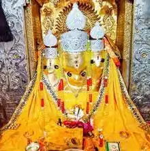 The unique feature of the temple is the triad, with Bagalamukhi central, and as an aspect of Parvati, between Lakshmi and Saraswati.[2] There are also statues of Krishna, Hanuman and Bhairav at the temple.[3]