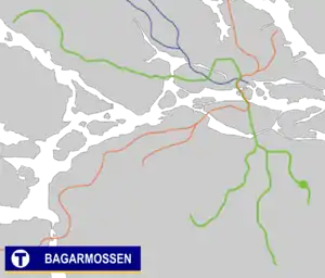 Bagarmossen metro station is on the green line of the Stockholm metro, located in Bagarmossen, Söderort in the south of Stockholm. The surface station was opened on 18 November 1958 as the southern terminus of the extension from Hammarbyhöjden. On 15 August 1994, the line was extended further to Skarpnäck.[2]