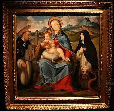 The Baglioni Madonna or Madonna and Child with Saint Jerome and Saint Anne is an oil on panel painting by Andrea Previtali, executed c. 1512–1513, now in the art gallery of the Accademia Carrara in Bergamo. His earliest surviving work, it is signed ANDREAS.BER.PIN.[1] Since 1900 it has been named after its last private owner Francesco Baglioni, who gave it to its present home. It belongs to the sacra conversazione genre. It was restored in 2011 by Amalia Pacia of the Sovraintendenza per i Beni Storici Artistici ed Etnoatropologici di Mialno and Maria Cristina Rodeschini from the Accademia Carrara