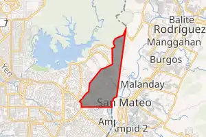 The Barangay is divided geographically by having high and low areas. The border between these two areas is the Marikina Valley Fault System that runs parallel with the Marikina River. The High area western part of the Barangay is the edge of the Guadalupe plateau where most of Quezon City lies while the lower area, the eastern side of Barangay lies at the west bank of the Marikina River. Lying directly on the Marikina fault line, Bagong Silangan is considered as a high risk area for earthquake.[1] Many residential building, commercial and institutional buildings lies directly or lies near the fault. While the lower part of Bagong Silangan lying near the bank of the river is prone to heavy flooding.[2] While most of the areas in Barangay is considered urban in density and infrastructure, about a quarter of Barangay's area are actually farmland the last remaining in Quezon City.