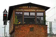 In August 2008, a new electronic interlocking controlled by the Leipzig Operating Centre (Betriebszentrale) replaced seven locally operated signal boxes, some using lever frames.[19] It controls the train traffic between Weinböhla and Dresden-Neustadt.[20] It replaced five mechanical interlockings of the Jüdel type and two power signal boxes (Befehlsstellwerk) of S&H type. An automatic track vacancy detection system was not installed. Two dispatchers direct operations using the Sächsischen Befehlsblocks (Saxon command block) system. An upgrade and adaptation of these systems in the course of the German Unity Transport Project (Verkehrsprojekts Deutsche Einheit) No. 9 has not been possible as the regulations could not have been complied with.[20] Many jobs were lost in relation to signalling, control of points and train detection. Of the seven signal boxes, only signal box 1 on the eastern side has been retained as a memorial.