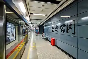 Baiyun Park Station (Chinese: 白云公园站), formerly called Baiyun New Town Station[1] during planning, is a metro station of Guangzhou Metro Line 2. It is located at the underground of Qile Road[2] at the centre area of the former Baiyun International Airport, in the Baiyun District of Guangzhou.[3] It started its operation on 25 September 2010.