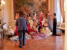 On the eve of le Bal, a Friday, the débutantes come together for the first time. Makeup and hair styling sessions start at 9:00am: with By Terry for makeup[36] and with Alexandre de Paris for hair.[37] After this, the débutantes put on their dresses, long gloves, shoes,[19] and jewels, and there are individual and group photo sessions[38] which last for the rest of the day.[35] On Friday evening, the débutantes' fathers and cavaliers are offered a waltz class with two dance teachers.[35]