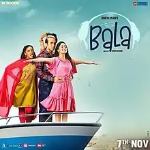 Principal photography began on 6 May 2019 in Kanpur and the film was also shot in Mumbai and Lucknow.[4] The soundtrack was composed by Sachin–Jigar; the film released in preview shows on 7 November 2019 and Indian theatres on the following day.[5] Made on a budget of ₹250 million (US$3.3 million),[6] Bala received generally positive reviews from critics, and it grossed ₹1.71 billion (US$22 million) worldwide. Later, it earned 3 nominations at the 65th Filmfare Awards – Best Actor for Khurrana, Best Supporting Actress for Pahwa, and Best Dialogue for Bhatt. The film was showcased in Indo-German Filmweek 2020 in Berlin on 27 September 2020.[7]