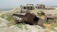 When looking at the outer wall of the main fortress, it is possible to see layers of building materials from years of destruction and re-fortification. The tanks and other war wreckage from the last 30 years are strewn about the top of the hillside. Much of the hillside is built up on tunnels and underground storage. Evidence of trenches from previous trench warfare encircles the upper most level of the hilltop, which is adorned with an Afghan flag. Wild dogs roam all over the hillside and a company from the Afghan Army is posted at the site. U.S. military and civilians occupied a site below the fortress during Operation Enduring Freedom. The occupants were warned when going up to the castle, to stay on the heavily used paths to avoid mines laid during the Soviet occupation.