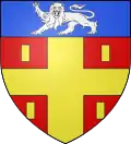 Blazon: Gules, a Cross of Or cantoned with 4 billets the same, in chief Azure charged with a lion passant guardant of Azure.
