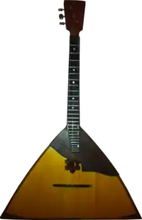 The balalaika (Russian: балала́йка, pronounced [bəɫɐˈɫajkə]) is a Russian stringed musical instrument with a characteristic triangular wooden, hollow body, fretted neck and three strings. Two strings are usually tuned to the same note and the third string is a perfect fourth higher. The higher-pitched balalaikas are used to play melodies and chords. The instrument generally has a short sustain, necessitating rapid strumming or plucking when it is used to play melodies. Balalaikas are often used for Russian folk music and dancing.