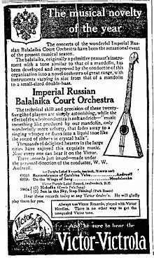 The end result of Andreyev's labours was the establishment of an orchestral folk tradition in Tsarist Russia, which later grew into a movement within the Soviet Union.[17] The balalaika orchestra in its full form consists of balalaikas, domras, gusli, bayan, Vladimir Shepherd's Horns, garmoshkas and several types of percussion instruments.