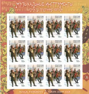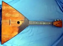 The first known document mentioning the instrument dates back to 1688. A guard's logbook from the Moscow Kremlin records that two commoners were stopped from playing the Balalaika whilst drunk.[13] Further documents from 1700 and 1714 also mention the instrument. In the early 18th century the term appeared in Ukrainian documents, where it sounded like "Balabaika". Balalaika appeared in "Elysei", a 1771 poem by V. Maikov.[14] In the 19th century, the balalaika evolved into a triangular instrument with a neck that was substantially shorter than that of its Asian counterparts. It was popular as a village instrument for centuries, particularly with the skomorokhs, sort of free-lance musical jesters whose tunes ridiculed the Tsar, the Russian Orthodox Church, and Russian society in general.[15]