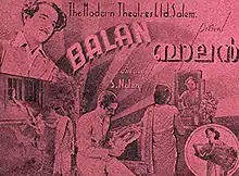 Balan is a 1938 Indian Malayalam-language film directed by S. Nottani.[2] It was the third feature film (after Vigathakumaran and Marthanda Varma) and first sound film in Malayalam.[3][4][5] Based on the short story "Vidhiyum Mrs. Nayarum" by A. Sundaram, its screenplay and dialogues are written by Muthukulam Raghavan Pillai. The film is a melodrama and was the first movie in this genre in Malayalam. It is produced by T. R. Sundaram of Modern Theatres, Salem.[4] The film, which stars K. K. Aroor, Master Madanagopal, M. V. Shanku, K. Gopinath, Alleppey Vincent, C. O. N. Nambiar, M. K. Kamalam, K. N. Lakshmi, Baby Malathi, A. B. Pious and Subhadra, is about the struggle of two orphaned children.[6] German cinematographer Bado Gushwalker handled the camera while Varghese and K.D. George did the editing. Its music was composed by K. K. Aroor and Ibrahim. There are overall 23 songs in the film.