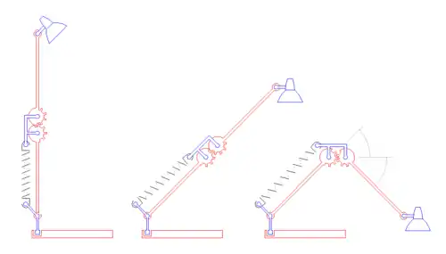 A lamp like the Tolomeo desk lamp has no parallelograms in either arm. In this modern lamp the tension springs are hidden in the arms. The lamp cap rotates the same direction as the upper arm and forearm.