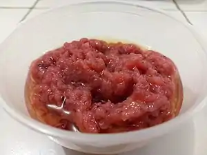 Balao-balao, also known as burong hipon ("pickled shrimp"), is a Filipino condiment of cooked rice and whole raw shrimp (esp. Alamang) fermented with salt and angkak (red yeast rice). Once stirfried, it can be eaten as is with rice or used as a dipping sauce for grilled or fried dishes. Depending on the salt content, it is fermented for several days to weeks. The lactobacilli involved in the fermentation process of the rice produces lactic acid which preserves and softens the shrimp.[1][2]