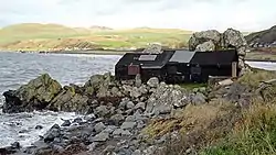 The First OS map shows a walled enclosure of about one third of an acre (one eighth of a hectare) located on the raised beach area on the east side of the bay, running up to and sheltered by a headland and well above the spring high tide mark on the raised beach.[2] The enclosure has four or so divisions and sub-divisions. Small structures are shown within the area that may be fishermen's huts.[2] A track ran from the entrance to the enclosure along the raised beach area and then up the slope to reach the top of the cliffs, having passed over the cave.[2] A hay ree for storing animal feed is marked on the OS map where the nearby Balcreuchan Burn reaches the sea.