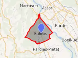 Baliros is located some 12 km south-east of Pau just west of Bordes. Access to the commune is by the D37 road from Narcastet in the north which passes through the centre of the commune and the village before continuing south to Pardies-Piétat. The village is served by bus routes 809, 810, and 811 of the Interurban Network of Pyrenees-Atlantiques which connect Pau with Arthez-d'Asson. The commune is forested west of the village with the eastern side farmland.[4]