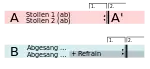 The musical form of a ballade stanza is a bar form (AAB), with a first, repeated musical section (stollen) setting the two initial pairs of verses (rhymes "ab–ab"), and the second section (abgesang) setting the remaining lines including the refrain verse ("bcbC"). The two statements of the "A" section often have different endings, known as "ouvert" and "clos" respectively, with the harmony of the "ouvert" ending leading back to the beginning and that of the "clos" ending leading forward into the "B" section. In many ballades, the final part of the "B" section may reintroduce melodic material referring back to the end of the "A" part, a feature known as "musical rhyme" (or, in German, Rücklaufballade). An alternative form employed by Machaut, known as ballade duplex or balladelle, has the B part also divided into two repetitions, with the refrain line sung as part of the repetition.[2]