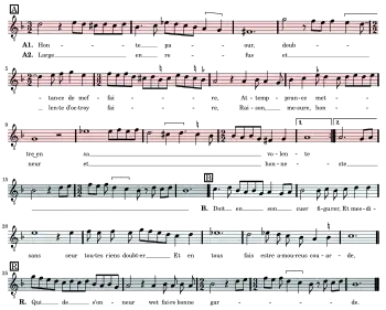 The formes fixes were standard forms in French-texted song of the fourteenth and fifteenth centuries. The ballade is usually in three stanzas, each ending with a refrain (a repeated segment of text and music).[1]
