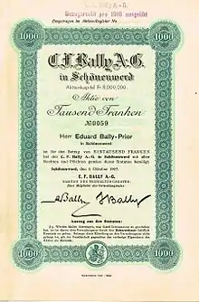 Bally was founded as a shoe making business in 1851 by Carl Franz Bally and his brother Fritz, in the basement of their family home in Schönenwerd, Solothurn, Switzerland. Carl Franz Bally had joined the family business, a silk ribbon manufacture, when he was 17, but decided to go into shoe manufacture after a stay in Paris. At the time of Carl's death in 1899 the company was manufacturing about two million pairs of shoes a year and employed 3,200 people.[2] The business continued under the management of Carl's sons, Eduard and Arthur.[3]