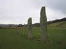 It includes an avenue of two rows of standing stones with 4 and 2 stones each, a stone circle, and a henge with a small burial cairn. According to the Historic Environment Scotland marker at the site, the circle and standing stones are the older structures and their construction dates back to over 4000 years ago. The tallest stone is 4 metres (12 feet) height. The two middle stones of the four stone line are heavily carved with cup and ring marks. The complex is designated a scheduled ancient monument by Historic Environment Scotland.[1]