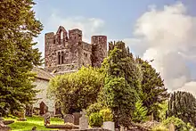 Balrothery Tower is a three-storey square plan rubble stone crenellated tower house built c. 1500. It has Trefoil headed openings with limestone surround and square headed openings with brick-dressed openings.