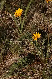 Balsamorhiza sericea is a species of flowering plant in the sunflower tribe of the plant family Asteraceae known by the common name silky balsamroot. It is native to the Klamath Mountains of northwestern California and southwestern Oregon, with additional populations in the Blue and Steens Mountains in eastern Oregon.[1] It grows in rocky areas, sometimes on serpentine soils.[2]