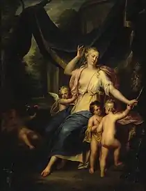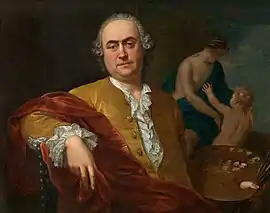 Balthasar Beschey painted single as well as group portraits. In his Self-portrait (Royal Museum of Fine Arts Antwerp), which the artist donated in 1763 to the Academy of Antwerp, he painted himself in a flamboyant manner with his right arm loosely hanging over the back of a chair and a large palette in his left hand. He is working on a figure composition but it is not clear exactly which subject he is painting. It could be a Venus with Cupid or alternatively, an allegory, possibly of the fine arts. The work is very similar in style to French portraiture of that time. Beschey also follows the French fashion with his yellow silk jacket with frill and powdered wig.[12]