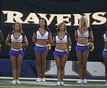 The Baltimore Ravens Cheerleaders are a cheerleading and dance squad for the Baltimore Ravens of the National Football League. Along with the Seattle Seahawks Dancers and the Tennessee Titans Cheerleaders the Ravens squad is a co-ed squad, with the female cheerleaders doing various dance moves, and the males working on stunts, as in traditional cheerleading. The group was founded in 1998, and currently consists of 48 members (20 stunt team performers and 28 dancers).[1] The squad performs at the Ravens home stadium M&T Bank Stadium. The squad's director is Tina Galdieri, who cheered at the 1996 Summer Olympics in Atlanta, as well as the World League of American Football's (later NFL Europe) Barcelona Dragons, and also led the University of Maryland's cheerleading squad to a national championship in 1999.[2] The squad also has a "Lil Ravens" summer program, and unlike the other squads, boys also are permitted to join.[3] The group makes various appearances at parties and corporate functions throughout the year.[4] The female members of the squad also has a swimsuit calendar, with their 2012 calendar taking place in the Bahamas.[5] The squad currently has 31 female members.