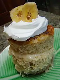 A banana cake is a cake prepared using banana as a primary ingredient and typical cake ingredients. It can be prepared in various manners, including as a layer cake, as muffins and as cupcakes. Steamed banana cake is found in Chinese, Indonesian and Vietnamese cuisine.[1][2][3] In the Philippines, the term "banana cake" refers to banana bread introduced during the American colonial period of the Philippines.[4]
