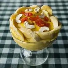 Banana Custard or Bananas and Custard is a type of traditional pudding made from banana slices mixed with custard.
