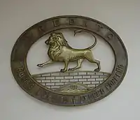 The upper body is an elaborate entablature with garlands, dentils, and a projecting, bracketed upper cornice. On top there is a balustered railing filling the space between three broken pediments, the one on the corner curved, with medallions on their centers. The medallions on the facades contain stained glass inserts, and the one on the corner a clock. First-floor openings are arched, those on the second are rectangular. The first-floor windows are covered by bulging cages of fine cast iron bars; those on the second floor are balustered. The entire ensemble is topped by a copper roof in a Mansard configuration.[6]