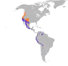 It ranges from British Columbia, Washington, Oregon, California, and southern Arizona south in higher elevations through Mexico and Central America to northern Argentina. In autumn it migrates out of its permanent resident range into northern California, New Mexico, and parts of Utah and Colorado. It is found from almost sea level to 3,600 m (12,000 ft), generally in oak, pine-oak, and coniferous forests. It feeds on seeds, notably acorns, as well as berries and small fruits.