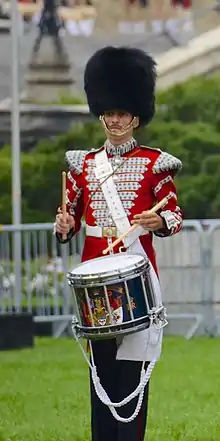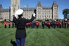 The Band of the Ceremonial Guard (La Musique de la Garde de cérémonie) is an ad hoc military band that is attached to the Canadian Forces Ceremonial Guard in Ottawa. All members of the band are fully trained members of the Canadian Armed Forces (CAF)[1] and consists of personnel principally from the two Foot Guards regiments (the Governor General's Foot Guards from Ottawa and the Canadian Grenadier Guards from Montreal) and has even since 2007 been manned by a pan–Canadian Forces approach that is inclusive to musicians from the Royal Canadian Navy, Canadian Army and Royal Canadian Air Force. The band forms a separate company within the CG and rely on the Headquarters Company for administration and support personnel. In full composition, the band is active from April to August.[2]