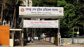 Students at the college demonstrated in 2015, calling for the reinstatement of the "carry on" examination system.[4] The Bachelor of Medicine, Bachelor of Surgery (MBBS) degree programme is divided into four parts by the first, second, third, and final professional examinations. If a student fails one of these exams, they may sit it again six months later. Under the 2002 "carry on" system, students could continue taking classes in the next academic session while preparing to retake an exam. This system was strongly favoured by medical students, but strongly opposed by their teachers. The Bangladesh Medical and Dental Council eliminated "carry on" in 2013, after which students who failed a professional exam were not allowed to continue classes until they had passed it, causing them to lose up to a year in the process.[5][6][7]