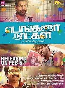 Bangalore Naatkal (English: Bangalore Days) is a 2016 Indian Tamil comedy-drama film directed by Bommarillu Bhaskar, which is a remake of the 2014 Malayalam film Bangalore Days written and directed by Anjali Menon. Featuring an ensemble cast consisting of Sri Divya, Bobby Simha, Arya, in the lead roles, it tells the story of three cousins who live their childhood dream of living and enjoying in the city of Bangalore. It also stars Rana Daggubati, Parvathy Thiruvothu (who reprising her role from the original), Raai Laxmi, Paris Laxmi, Prakash Raj and in other pivotal roles. Samantha Ruth Prabhu appears in a cameo. Produced by Prasad V Potluri under his banner PVP cinema, the film released on 5 February 2016. Unlike the original, this movie received mixed reviews and failed at the box office, with critics and fans drawing comparisons with the original.