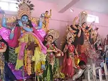Saptashati recitation at the temple. On the eighth day of durga puja, a part of ritual, the goddess Durga is offered sacrifices in the form of Chhagars (young male goat kids) and Paaras (male buffaloes). Their sacrifices represent the end of Kaama (extreme carnal desires) and Krodha (extreme anger). While the Paaras are offered given to local Chamaars (who skin them and leave the body for the vultures in a place away from village). The chhagars are, however, accepted as god offering and eaten by people. These Chhagars and mostly skinned by local Paseebas who get skin, intestine, hoofs, balls and some money as their wage. The estimated number of Chhagars offered is around 500 (at Bangaon and Mahishi Bhagwati Mandir) on that day itself. Durga Puja ends on the tenth day from its beginning.