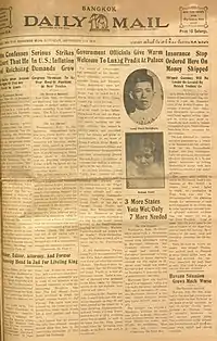 The Bangkok Daily Mail was an English-language daily newspaper in Thailand first published at the beginning of January 1910. Its former name was Siam Free Press. [1][2] The newspaper was owned by King Prajadhipok (Rama VII) and run by Prince Svasti and Louis Girivat.[3] Its office was located on Si Phraya Road.[4] On 8 August 1933, The Bangkok Daily Mail was suspended by the authorities and was allowed to resume publication following an apology and the payment of a deposit 'for future good behavior'.[5][6][7][8] However, it was closed once and for all by the Government in October 1933 "because of its royalist connections".[9][10]
