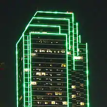 The building's facetted facade was first accented at night by nearly 2 miles (3 km) of green argon lighting running primarily at the edges and corners of the tower. Due to the green lighting, the building is often referred to as "The Pickle." Green was chosen over red or blue because it is more visible from a distance. It has also been reported that the second tower, if built would have been accented with purple lighting (often called “The Eggplant”).