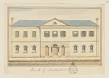 Headquartered in London, the bank was incorporated by Royal Charter in March 1834. It had initially been planned to additionally include first South Africa and then Ceylon in the bank's operations; however, both these moves were blocked by the Lords of the Treasury. Its first branch opened in Sydney on 14 December 1835, followed by branches in Hobart and Launceston on 1 January 1836, in the latter city by taking over the former Cornwall Bank. A Melbourne branch opened on 28 August 1838[2] and an Adelaide branch on 14 January 1839. It opened a Perth branch in May 1841 when it absorbed the original Bank of Western Australia; however, the branch was closed in 1844 and the bank would not reopen in that city until 1894. It suffered financial difficulties during the 1840s depression, in part because of a controversial loan to the failing Bank of Australia which resulted in significant litigation.[3][4][5]