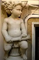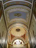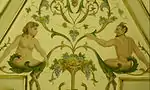 This is now the entrance hall and shop, and the walls are used to display temporary exhibitions. The saloon was also the grand hall, reception room, picture gallery and ballroom, with a little furniture at the sides, many oil paintings and gasoliers. It has rooflights with painted plaster decorations in the classical style around them. The marble fireplace features two large putti holding trumpets. Putti are also the central feature on the grand staircase ceiling – possibly a wistful element as Akroyd and his wife had no children.[2]