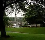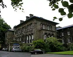 By 1867 Akroyd was Member of Parliament for Halifax and obliged to entertain on a grand scale. When the future Edward VII visited Halifax to open the town hall in 1863, the royal party ate lunch and dinner with the mayor who had more space at Manor Heath, although the prince did visit the Akroyd family business at Haley Hill Mills.[3] For this reason, the 1867 wing, designed by John Bownas Atkinson of York at a cost of £20,000,[1] was spacious and decorated to impress. It had a porte-cochere, saloon, drawing rooms, library and billiard room. At its busiest, the mansion had 25 servants.[2] Akroyd extended his influence beyond Haley Mills and Bankfield by building Akroydon close by: a model village of gothic terraced houses, allotments, park, cooperative, stables and All Souls Church, all designed by George Gilbert Scott.[4]