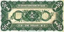 Following the Chinese tradition of issuing new money in a new reign, the Xuantong administration had the design of the official Ta-Ching Government Bank paper notes somewhat changed to herald in the new emperor.[1] The new design was inspired by the designs of the banknotes of the United States dollar of this era.[1]