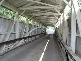 The Banks Covered Bridge is a wooden covered bridge in Wilmington Township, Lawrence County, Pennsylvania, United States.[1]: 2 It spans the Neshannock Creek southeast of New Wilmington.[1]: 2, 5 Constructed in 1889, the bridge is a Burr arch truss built on stone foundations and supported by steel girders; it is 121 feet (37 m) long.[1]: 6