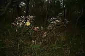 Associated species in the Sydney region include heathland species such as heath banksia (Banksia ericifolia), coral heath (Epacris microphylla) and mountain devil (Lambertia formosa), and tick bush (Kunzea ambigua) and prickly-leaved paperbark (Melaleuca nodosa) in taller scrub, and under trees such as scribbly gum (Eucalyptus sclerophylla) and narrow-leaved apple (Angophora bakeri) in woodland.[5] The Agnes Banks Woodland in western Sydney has been recognised by the New South Wales Government as an Endangered Ecological Community. Here B. oblongifolia is an understory plant in low open woodland, with scribbly gum, narrow-leaved apple and old man banksia (B. serrata) as canopy trees, and wallum banksia (B. aemula), variable smoke-bush (Conospermum taxifolium), wedding bush (Ricinocarpos pinifolius), showy parrot-pea (Dillwynia sericea) and nodding geebung (Persoonia nutans) as other understory species.[22]