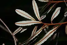 Banksia oblongifolia is a shrub that can reach 3 m (9.8 ft) high,[2] though is generally less than 2 m (6.6 ft) high,[3] with several stems growing out of a woody base known as a lignotuber. The smooth bark is marked with horizontal lenticels, and is reddish-brown fading to greyish-brown with age. New leaves and branchlets are covered with a rusty fur. The leaves lose their fur and become smooth with maturity, and are alternately arranged along the stem. Measuring 5–11 cm (2.0–4.3 in) in length and 1.5–2 cm (0.59–0.79 in) in width, the leathery green leaves are oblong to obovate (egg-shaped) or truncate with a recessed midvein and mildly recurved margins, which are entire at the base and serrate towards the ends of the leaves. The sinuses (spaces between the teeth) are U-shaped and teeth are 1–2 mm long. The leaf underside is whitish with a reticulated vein pattern and a raised central midrib.[4] The leaves sit on 2–5 mm long petioles.[2]