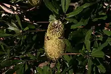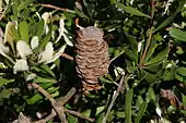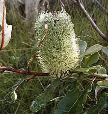 Flowering has been recorded between January and October, with a peak in autumn and early winter (April to June).[5] The inflorescences, or flower spikes, arise from the end of 1 to 5 year old branchlets, and often have a whorl of branchlets arising from the node or base. Measuring 5–15 cm (2.0–5.9 in) high and 4 cm (1.6 in) wide, the yellow spikes often have blue-grey tinged limbs in bud,[2] though occasionally pinkish, mauve or mauve-blue limbs are seen.[6] Opening to a pale yellow after anthesis, the spikes lose their flowers with age and swell to up to 17.5 cm (6.9 in) high and 4 cm (1.6 in) wide, with up to 80 follicles. Covered with fine fur but becoming smooth with age, the oval-shaped follicles measure 1–1.8 cm (0.39–0.71 in) long by 0.2–0.7 cm high (0.1–0.3 in) and 0.3–0.7 cm (0.12–0.28 in) wide.[2] The bare swollen spike, now known as an infructescence, is patterned with short spiky persistent bracts on its surface where follicles have not developed.[4] Each follicle contains one or two obovate dark grey-brown to black seeds sandwiching a woody separator. Measuring 1.2–1.8 cm (0.47–0.71 in) long, they are made up of an oblong to semi-elliptic smooth or slightly ridged seed body, 0.7–1.1 cm (0.28–0.43 in) long by 0.3–0.7 cm (0.12–0.28 in) wide. The woody separator is the same shape as the seed, with an impression where the seed body lies next to it.[2] Seedlings have bright obovate green cotyledons 1.2–1.5 cm (0.47–0.59 in) long and 0.5–0.7 cm (0.20–0.28 in) wide, which sit on a stalk, or 1 mm diameter finely hairy seedling stem, known as the hypocotyl, which is less than 1 cm high. The first seedling leaves to emerge are paired (oppositely arranged) and lanceolate with fine-toothed margins, measuring 2.5–3 cm long and 0.4–0.5 cm wide. Subsequent leaves are more oblanceolate, elliptic (oval-shaped) or linear. Young plants develop a lignotuber in their first year.[2]