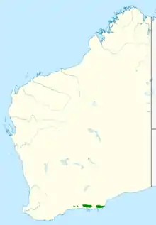 Endemic to Western Australia, Banksia petiolaris is found near the state's south coast from the vicinity of Munglinup east to Israelite Bay,[2] concentrated in two disjunct ranges—an eastern one around Cape Arid National Park, and western one east of Scaddan. It is found in white sandy soils in kwongan or mallee heathland, but sometimes occurs with the taller B. speciosa. It is often locally common, with many populations over 100 plants in size.[14]