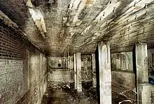 The underground bunker comprised two levels, a ground floor and basement both 9' (2.75m) in height. The exterior walls of the structure were constructed of brick approximately 2' (61 cm) in thickness, and were protected with earth filling. The Interior partition walls were mostly constructed of brick and timber and clad with caneite. A visitor to the bunker in the 1970s stated that the interior was painted "in army colours." The ceiling and floors comprised reinforced concrete 4" (10.2 cm) thick. The flat, overhanging concrete roof of the bunker, was at least 18" (45.7 cm) thick and was designed survive a direct hit from a 500 1b bomb. A 3/4" (1.9 cm) thick layer of asphalt was laid over the flat concrete roof as a damp course. The asphalt was then covered by at least 2' 3" (68.6 cm) of earth fill.[1]