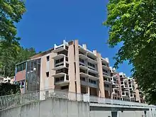 The village people started moving in the 19th century: people began to abandon the tight housing on the heights to build their houses near the crossroads of the roads to Sisteron, Apt, Manosque and Forcalquier in about 1840–1880. This new community was called La Bourgade.[27] The old village was not abandoned immediately as the church was enlarged and a hospital was built on the heights. In 1887, however, a college was built in the new village[31] on the Market Square (Place du Marché).[27] In 1905 a water jet fountain[27] sourced from the Brieux and fed by an underground aqueduct 3 km long[37] was built in the new village. Thereafter all new buildings, private or public, were built in the lower village (a church in 1911, a hospital in 1930) and, in 1950, the Orchards began to be converted to housing zones.[31]