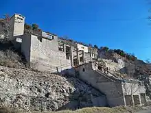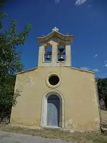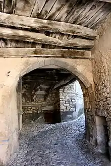 The term grange (barn) in this area refers to an isolated farm: this toponym is present in La Grange (at the northern border of the commune), also at La Grange (outside the village), and in Les Granges de Dauban.[18] The hill overlooking the village is called Le Défens: this is an area, owned by the lord or the community, where herds were banned.[18] Le Clos de Gardon is a cultivable area where the material from road ballasting was used to enclose the fields and meadows with a dry stone wall.[18] Les Chastellas was a fortification at high altitude[18] (which has been confirmed by excavations, see below) and La Tuilerie was a tile production workshop prior to the 18th century (before the term tuilière was used).[18]